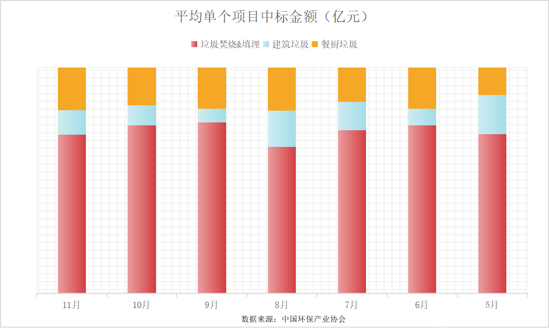 2020年前11個月,全國垃圾焚燒中標項目共計311項,總投資金額共計655.15億元;餐廚垃圾處理處置中標項目共計361項,總投資金額194.6億元;2020年5月到11月,全國建筑垃圾處理處置中標項目共計213項,總投資金額61.85億元。